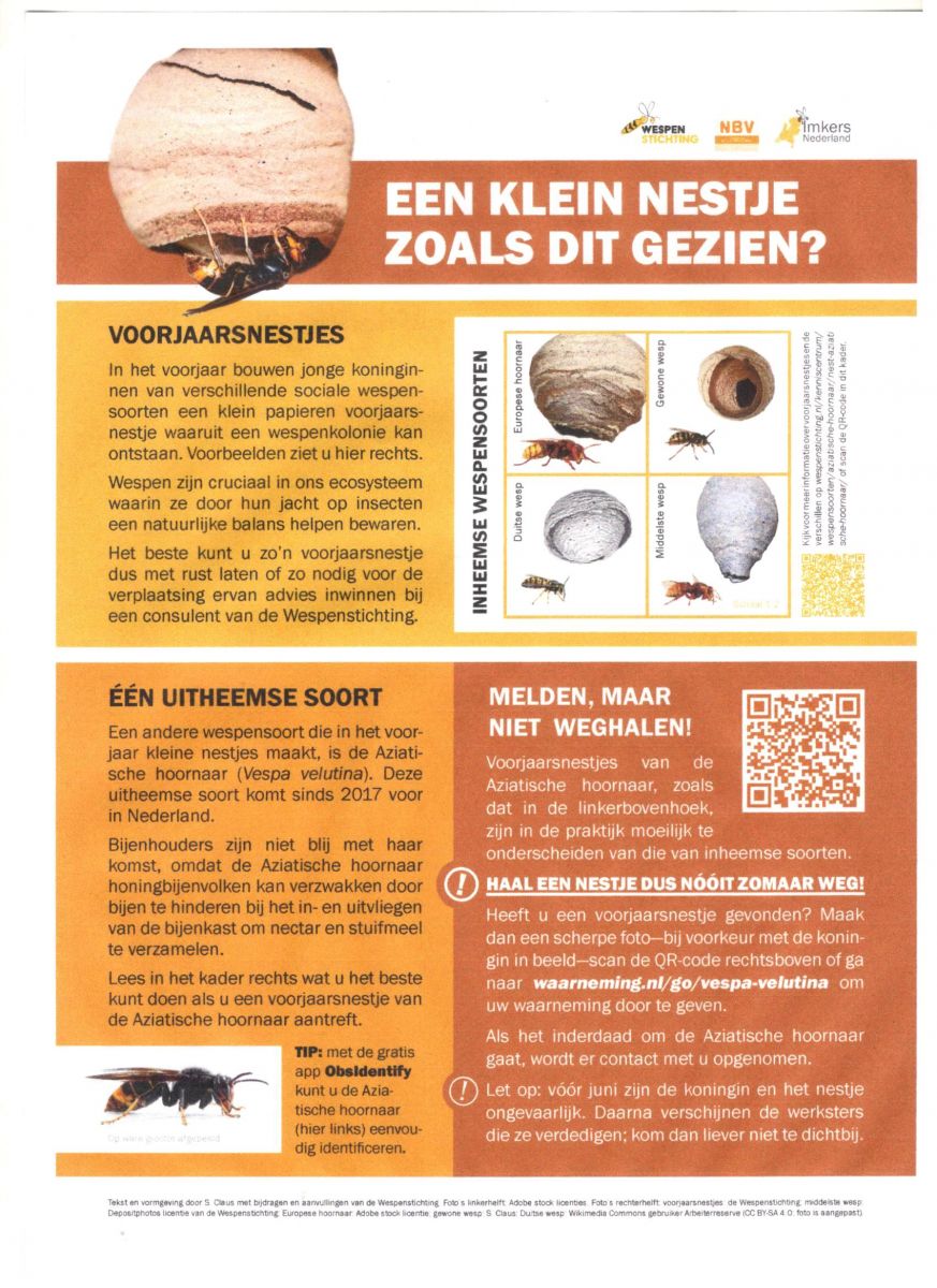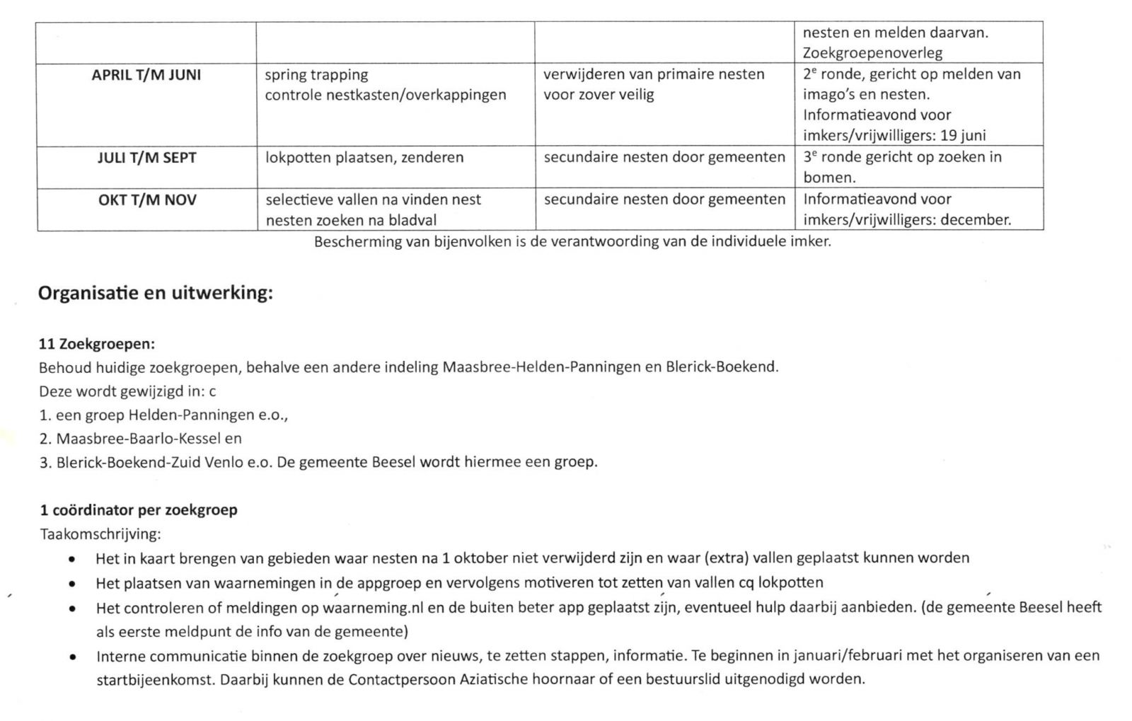 * Januari t/m Maart: opsporen zg embryonesten, een beginnend klein nest van papier maché in schuurtjes, onder een afdak, in houtopslag. deze nestjes kunnen eenvoudig verwijderd worden. Verwar ze niet bij beginnende wespennestjes die er verdacht veel op lijken, eerst kijken of er een Aziatsche Hoornaar koningin te zien is! Voorbereiding vallen maken, aanschaffen en plaatsen. Let op: plaats vallen in de directe omgeving van nesten van het vorig jaar, met name de laat ontdekte/ verlaten nesten. De A.H. koninginnen zoeken haar winterverblijf vaak in de buurt van die nesten.