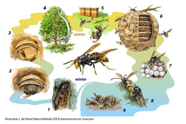 Informatie over de levenswijze van het vroege voorjaar ( met primaire nesten in schuurtjes onder afdakjes in houtopslag) tot het late najaar ( met de inmiddels bekende strandbal grote nesten, listig hoog in bomen verstopt of in heggen groeiend tussen de bladeren). Een prachtig vormgegeven insect maar uiterst bedreigend voor diverse bestuivende insecten en een regelrechte aanslagpleger op de inmiddels door allerlei industrialisatie en verkeersbewegingen verzwakte biodiversiteit.